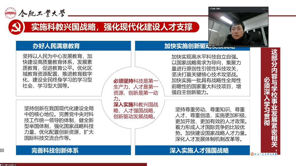 开班仪式在庄严的国际歌声中落下帷幕。随后,巩惠玲以“学习贯彻党的二十大精神,推动教育工作高质量发展”为主题,为全体学员带来第一堂党课。她向学员们介绍了党的二十大召开的盛况,解读了党的二十大报告的主要内容,强调全体学员要用二十大精神武装头脑、指导工作。整场党课中,巩惠玲结合党的二十大精神,从深刻理解新时代新征程中国共产党的使命任务、马克思主义中国化时代化等方面深入剖析,并对“科技是第一生产力、人才是第一资源、创新是第一动力”的论述进行了深刻解读。党课最后,巩惠玲希望全体学员要以实现中华民族伟大复兴为己任,增强做中国人的志气、骨气、底气,不负时代,不负韶华,不负党和人民的殷切期望,矢志成长为“有理想、敢担当、能吃苦、肯奋斗的新时代好青年”。