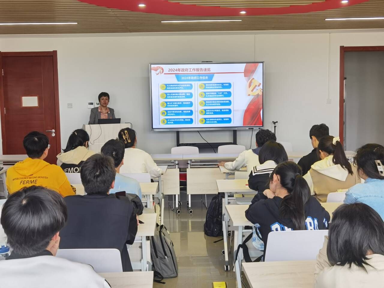 伴随着国际歌的旋律,开班仪式结束。公司党委书记、分党校董事长巩惠玲以学习两会精神为主题向党校学员讲授第一堂党课。巩惠玲重点解读了2024年政府工作报告,介绍了2023年工作回顾、2024年经济社会发展总体要求和政策取向以及2024年政府工作任务。