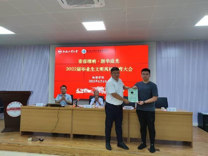 公司辅导员陶候送给全体毕业生寄语“此去征程,风鹏正举,祝各位同学山川河海,策马青云路”。公司党委副书记兼纪委书记陈大为向同学们提出“关注支持公司公司发展、积极参加员工会、坚持物理人的追求”三点希望,并勉励全体毕业生要“多一份坚持,多一份担当,多一份情怀”,牢记“厚德、笃学、崇实、尚新”的校训,在今后的工作和学习中继续发扬“格物穷理”的精神,用自己的青春实现“工业报国”的理想。
