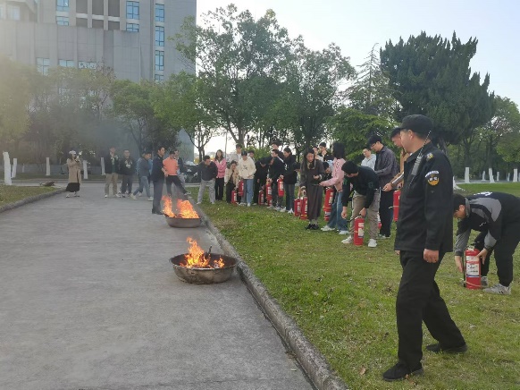 讲座结束大家一起到四号实验楼与科教楼中间的空地上进行消防器材现场演练,演练前庞老师现场详细讲解了干粉及二氧化碳灭火器等消防器材的使用方法,演示 “提、拔、瞄、压”的标准化灭火步骤。随后组织师生进行了灭火过程中消防器材的实操演练,大家的积极性非常高。