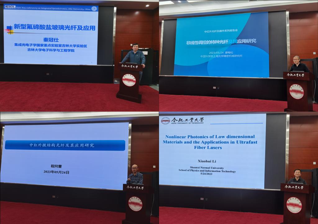 秦冠仕教授以“新型氟碲酸盐玻璃光纤及其应用”为题,介绍了在氟碲酸盐玻璃光纤设计与制备、高功率中红外超连续相干光源、宽带光纤放大器等方面的研究工作。廖梅松教授以“非线性调控的特种光纤及其在激光技术中的应用”为题,介绍了面向当前和未来先进激光技术的需求,开展具有不同非线性特征的特种光纤研究,及其在激光传输与超连续谱技术中的应用。程同蕾教授以“中红外微结构光纤及其应用”为题,介绍了中红外光纤的基本特性、制备方法以及近年来在激光器,传感领域和非线性器件方面的研究进展。李晓辉教授以“低维材料的非线性光学特性及超快光纤激光技术研究”为题,介绍了低维窄带隙材料的非线性光学特性研究及其在超快光子学和高性能光纤激光器中的理论和应用研究。