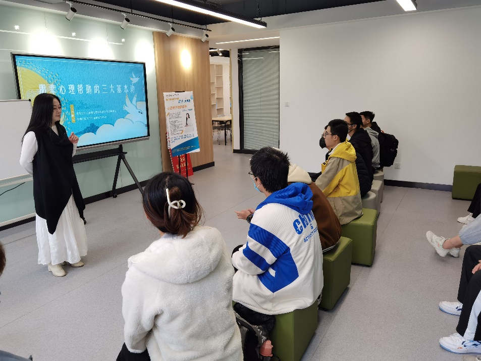 活动围绕“朋辈心理帮助三大基本功”展开技能培训。贾靖华从心理委员角色定位出发,指出进行朋辈心理帮助是助人自助的过程,为同学们分析了心理帮助中助人自助、不求不助、保护双方的原则。贾靖华重点讲解了当同学们进行朋辈心理帮助时需要关注的几个重点:倾听需要用心,陪伴就是在心理帮助的过程中帮助同学冷静、缓冲情绪,共情和平等、尊重是朋辈心理辅导员对同学采取的内在态度。最后,贾靖华指导同学们现场模拟咨询师与来访者的情景,让同学们深入了解朋辈心理帮助。