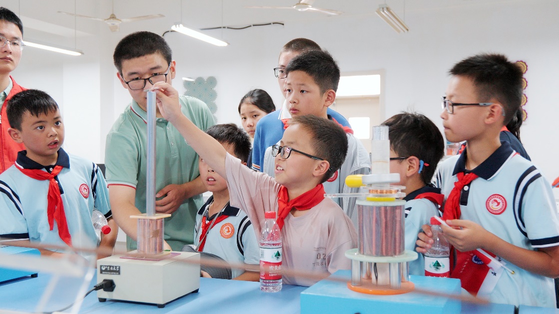(少先队员们动手体验物理实验 周翔骏 供图)
