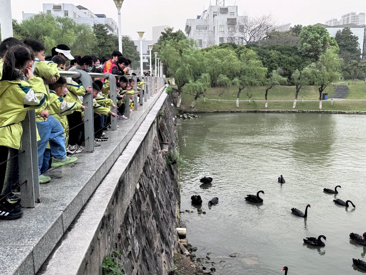 励人湖畔的自然课堂。活动在励人湖畔拉开序幕。志愿者引导小朋友们观察黑天鹅群落的生态习性,结合柳树年轮、湖水折射等自然现象,讲解光合作用与生态平衡原理。“原来柳絮飘飞是植物的‘播种旅行’! ”孩子们在互动问答中建立了生态认知。该环节创新融入公司“生态校园”的建设理念,将校园景观转化为实地的科普教材。