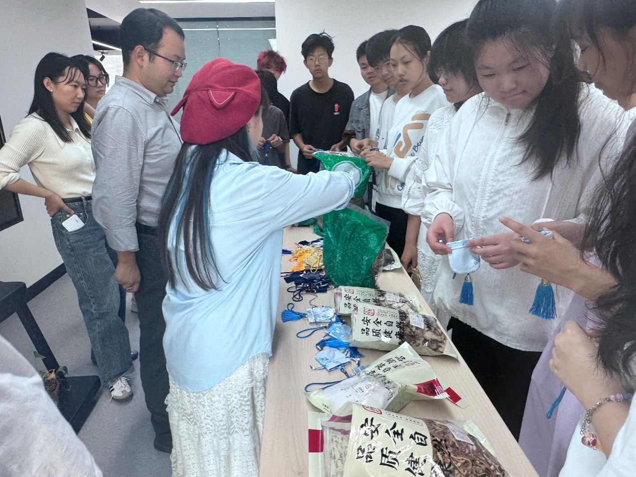 讲解完成后,同学们亲自动手体验制作中药香囊。大家认真地挑选香囊样式,再小心翼翼地填充艾草、丁香、薄荷等药材,在制作过程中互相交流、互相帮助,气氛十分融洽。同学们表示:“制作香囊的过程让我感到非常放松,仿佛所有的压力都随着草药的填充而消失了。而且,亲手制作一个香囊,还能感受到传统文化的魅力,这种体验非常棒!”