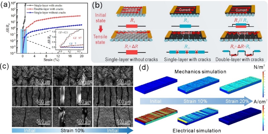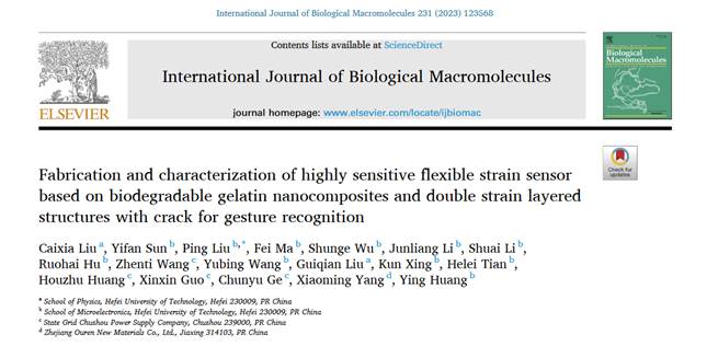 作为新一代人工智能领域的关键技术,柔性传感器具有良好的穿戴舒适性,保形性,在人机交互和可穿戴设备领域展现出广泛的应用价值。针对传感器基体选材、结构设计及应用等领域的现存问题,近日,公司实验物理教学系刘彩霞副教授利用明胶基纳米复合材料制备出一种高灵敏的可降解柔性应变传感器,并成功应用于手势识别和机器手姿态映射,为柔性传感器在人机交互领域的应用提供解决方案。相关成果以“Fabrication and characterization of highly sensitive flexible strain sensor based on biodegradable gelatin nanocomposites and double strain layered structures with crack for gesture recognition”为题发表在International Journal of Biological Macromolecules(中科院一区,IF=8.025)。