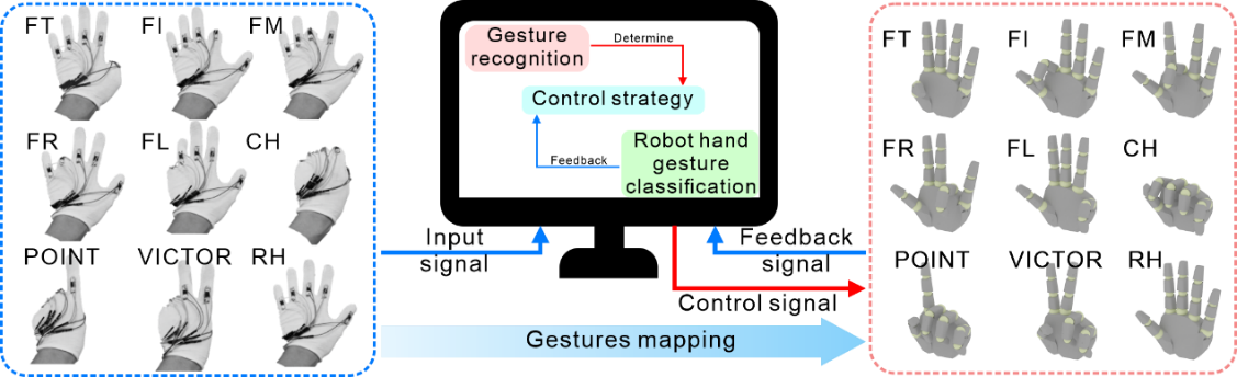 该工作制备可生物降解的明胶纳米复合材料,通过丝网印刷工艺加工具有双应变层裂纹结构的柔性应变传感器,所制得传感器具有良好拉伸应变(可达20%)、高应变系数(1296)、低迟滞(±2.5%)、快速响应(60 ms)和良好可重复性(6000次循环)。将传感器用于检测人体手部姿态并实现手势分类识别,结合气动驱动系统完成从人体手势到软体机械手的手势映射流程,图1为明胶基导电复合材料合成机理,图2为柔性可降解应变传感器结构设计示意,图3为基于柔性传感器的机械手手势映射流程。文章第一作者为英国365集团刘彩霞,合作者为微电子公司柔性传感器课题组黄英教授、刘平副教授和研究生孙一帆等。该研究得到了中央高校基本科研业务费,浙江省“尖兵”“领雁”研发攻关计划以及浙江省重点研发项目的支持。