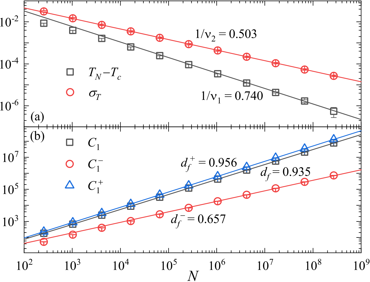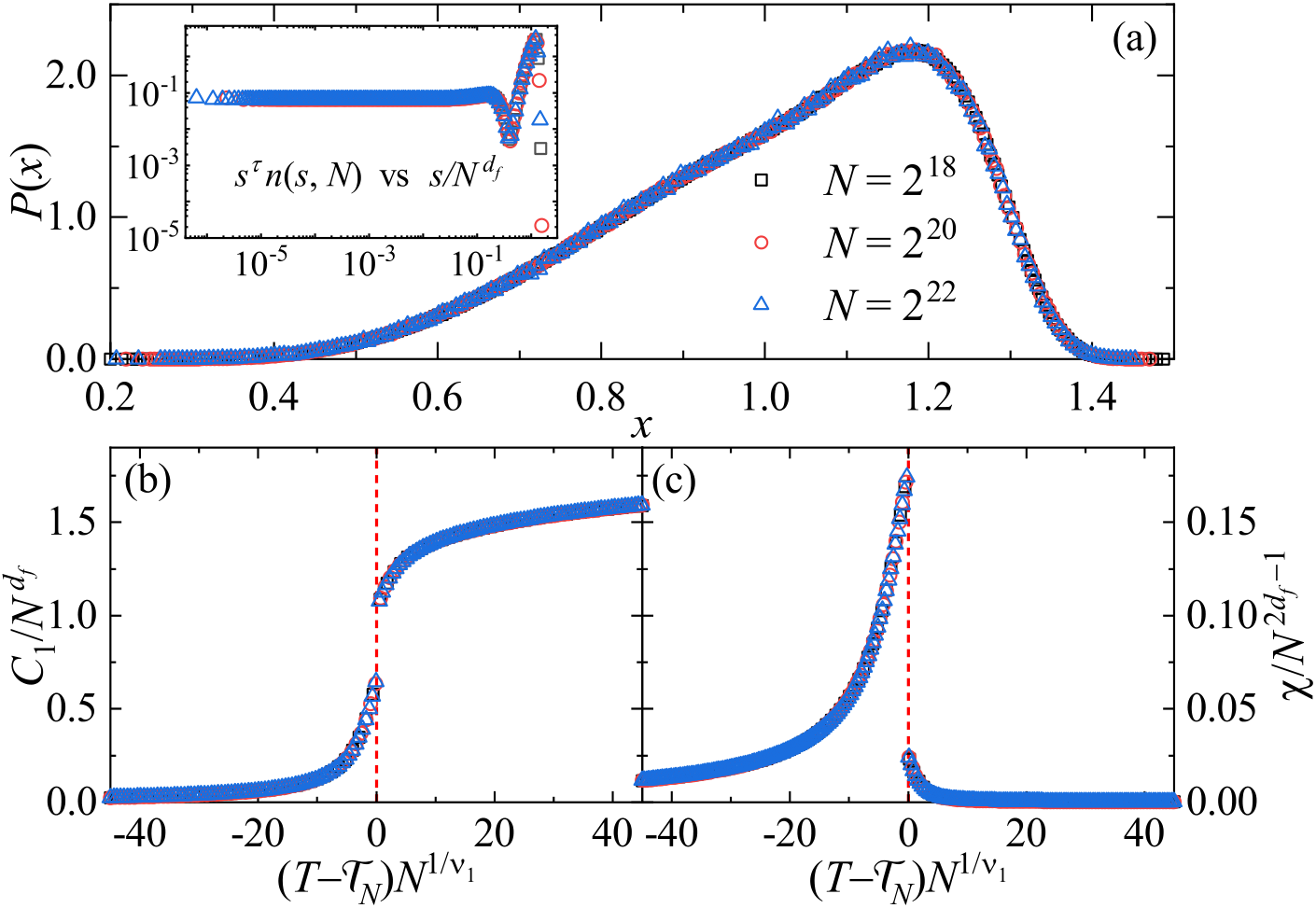 图1 在基于事件的系综下,爆炸逾渗的相关物理量展现出标准的有限尺度标度行为。