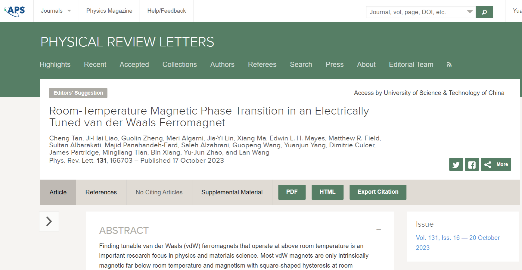 近日,英国365集团王澜教授带领的低维磁性与自旋电子器件研究团队在范德瓦尔斯磁性晶体磁相变的电学调控研究中取得新进展,初步研究结果以“Room-Temperature Magnetic Phase Transition in an Electrically tuned van der Waals Ferromagnet”为题发表在物理学著名期刊Physical Review Letters上发表,并被选为“编辑推荐”(Editors’ Suggestion)论文。
