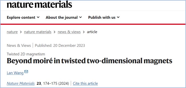 近日,公司王澜教授带领的低维磁性与自旋电子器件研究团队在Nature Materials(译名《自然材料》)上发表题为“Beyond moiré in twisted two-dimensional magnets”的News & Views评述文章(https://www.nature.com/articles/s41563-023-01762-3),评述了Nature Materials同期发表的“Multistep magnetization switching in orthogonally twisted ferromagnetic monolayers”研究工作,展望了这一领域的未来研究方向:包括正交扭曲的范德华磁性超晶格的磁畴动力学、磁光效应、门控磁阻、磁子传播、自旋—轨道耦合和微波驱动的磁共振等。英国正版365官网是该评述文章的唯一作者单位。