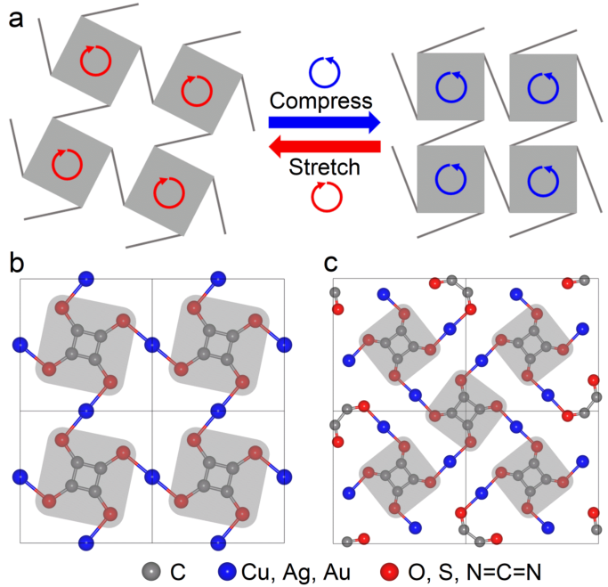 图1:(a)膨胀材料的变形机制由旋转机制驱动。灰色方块代表刚性单元,黑线代表线性连接体。(b)顺式和(c)反式-M2C4X4的几何结构。蓝色和灰色球代表金属原子和碳。红色球代表功能组−O、−S 和 −NCN。黑线表示晶胞。
