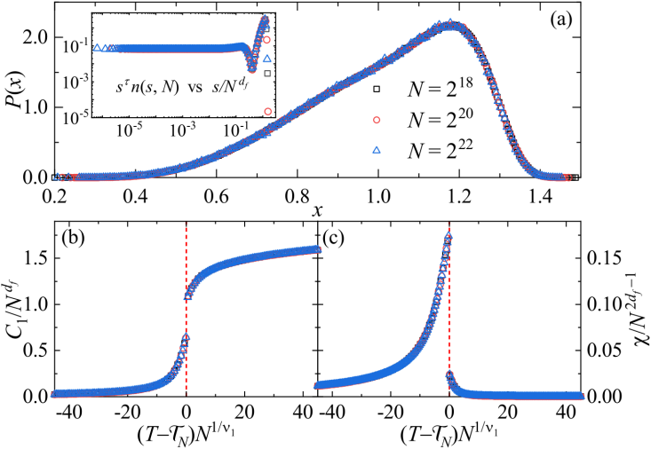 Figure 2 Multiple scalings in explosive percolation, and the predictions from the crossover finite-size scaling.
