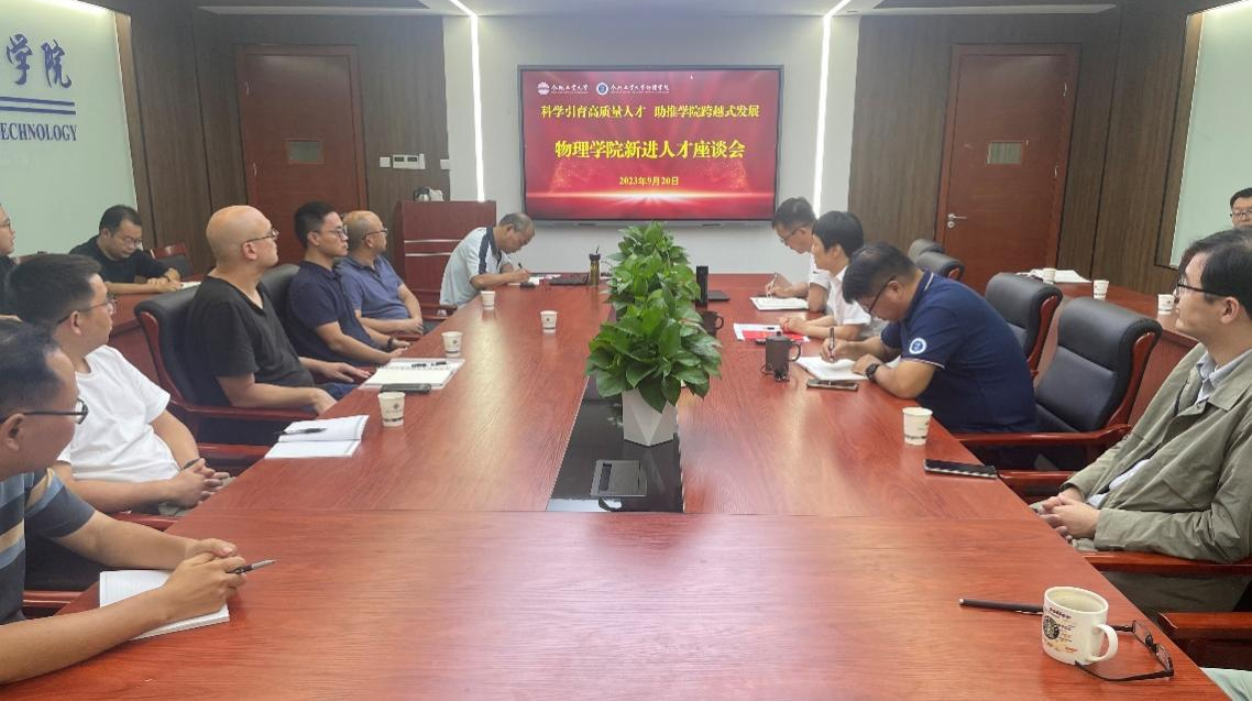 To celebrate the 39th Teachers' Day and in alignment with the university's talent development initiatives, the School of Physics convened a symposium for new talents in Conference Room B706 of the Jade Science and Education Building on September 20th at 15:30. The symposium's theme was "Cultivating High-Quality Talents through Scientific Endeavors for to Boost the School’s High-Quality Development." The event was led by Gong Huiling, the Secretary of the School Party Committee, and attended by other school leaders, recently recruited talent representatives, and members of the School Party committee.